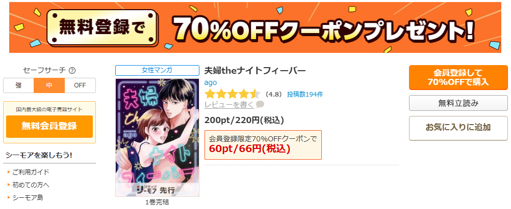 実際に、コミックシーモアなら、初回限定70%OFFクーポンを使えばたったの66円で読めちゃうんですから、これを使わない手はないですよ。