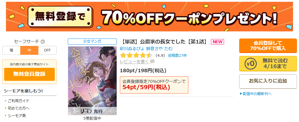 コミックシーモアなら、上限2,000円の70%OFFクーポン配布中なので、お得に読めますよ。